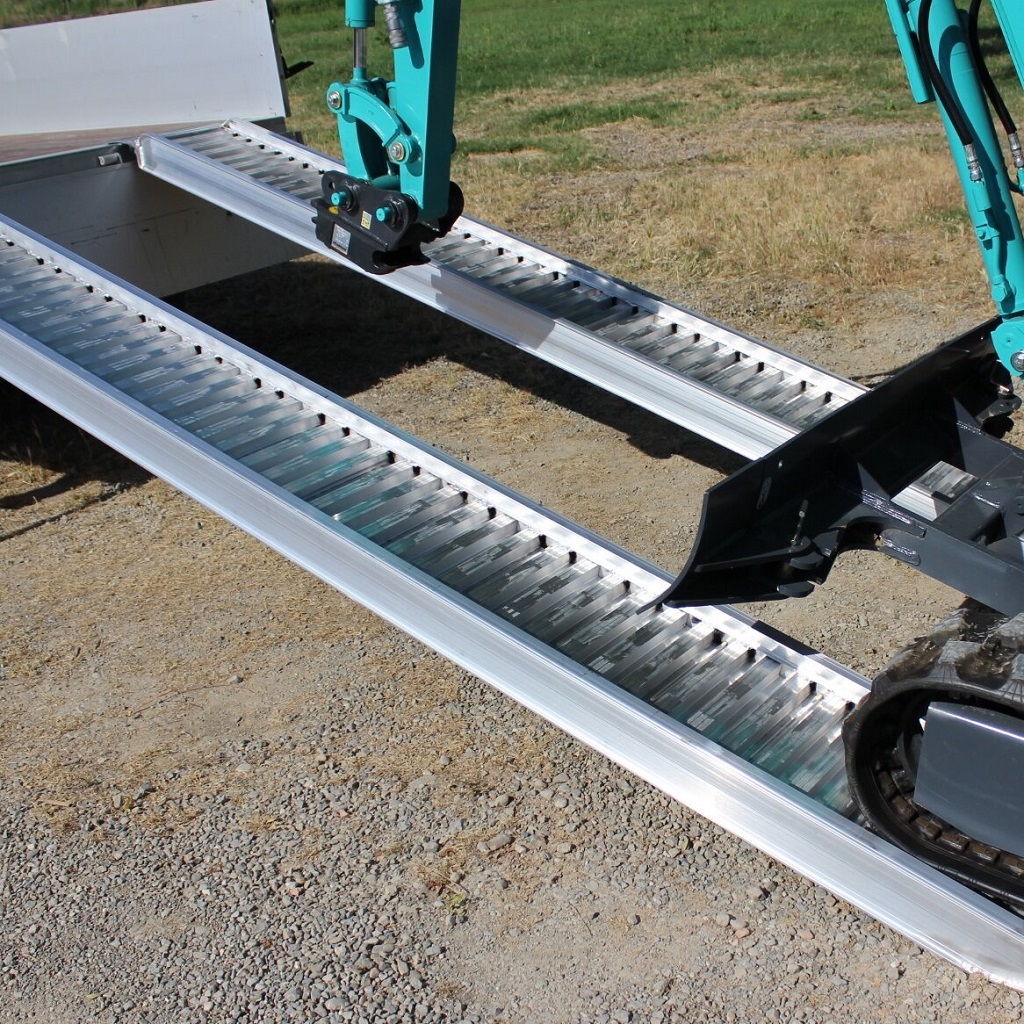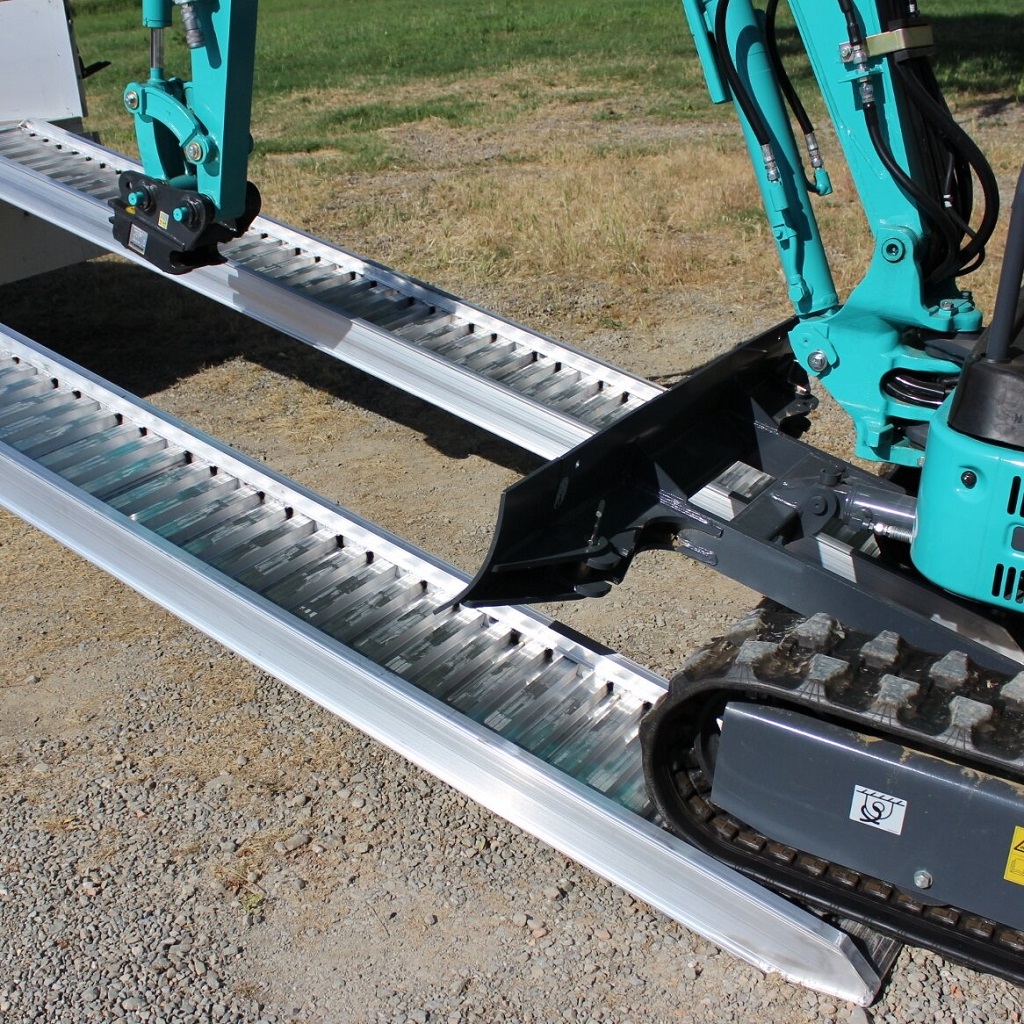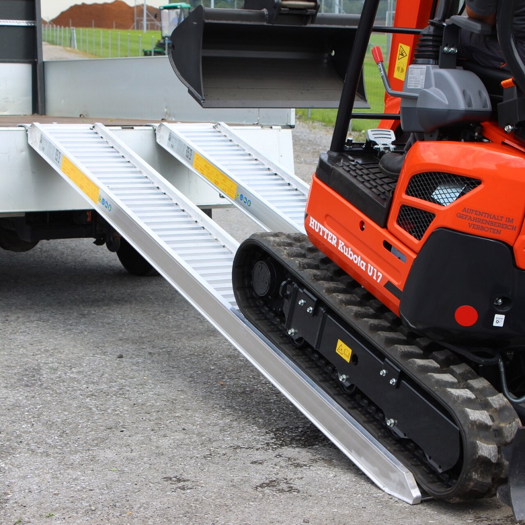 Kjørebruer fra CLM. Disse kjørebruene er godt egnet for lasting av kjøretøy med medium vekt, som minigravere, kompaktlastere, dumpere, biler, profesjonelle hagemaskiner utstyrt med hjul eller gummispor up til en maksimal kapasitet av 6,45 tonn per par. Lette med høy kapasitet og høy driftssikkerhet. Disse kjørebruene er som standard laget med sidekanter, som hjelper operatøren som kjører maskinen opp bruene. Ved behov kan rampene leveres uten kanter.