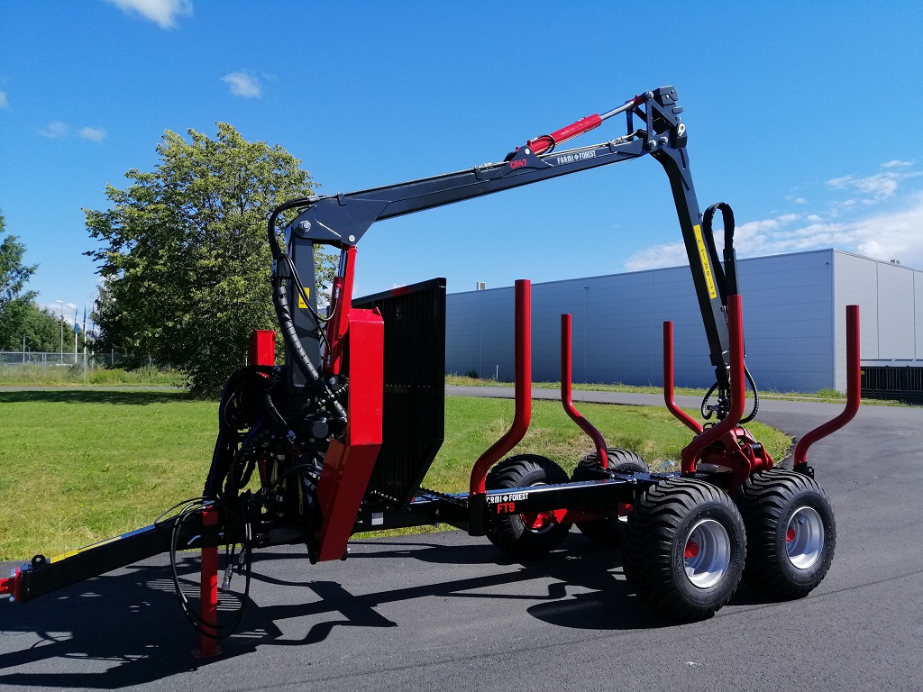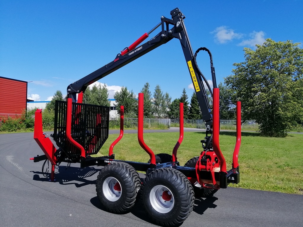 Nye Farmi FT9/CR47 tømmerhenger. Finske kvalitetshengere. Henger – 9 tonns henger med brems på 2 hjul. – Sving på drag med doble sylindere. – 3 par stakesett – 400 ELS hjul Kran – 6,9 meters kran – Lavette støttebein – Lettvektsentral – 3 tonns rotator og demping/brems i klofeste.