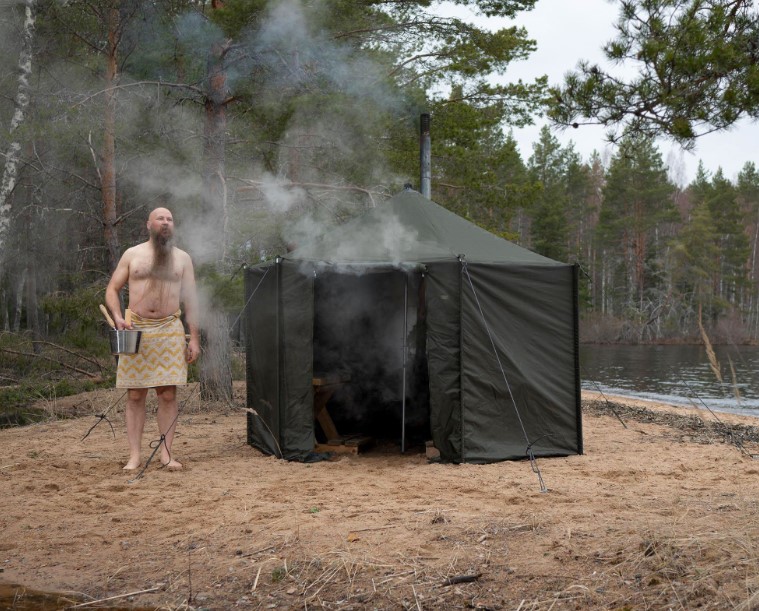 Et bærbart badstuetelt for fire personer for utendørs bruk. Enkel å bære og sette opp nesten hvor som helst. Ta den med til stranden, dype skoger, fjell eller bakgård og nyt en skikkelig varmende finsk badstuøkt uansett hvor du er. Komfyr og benker selges separat!