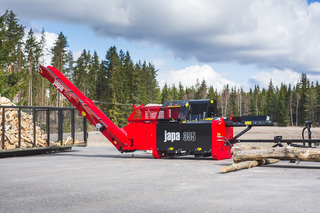 Japa® 395 er en ny generasjons vedmaskin. Pålitelighet og sikkerhet var Japas sentrale prioriteringer i utformingen av den nye maskinen. Den nye Japa® 395 inkluderer en hydraulisk kløyver, oppgradert pusher og en hydraulisk justerbar kniv, stokklengdebegrenser, styrplate og smørepumpe. Det nye designet og de aktive sikkerhetsgitterene sikrer god synlighet inne i maskinen og letter vedlikehold av nøkkelkomponenter. Hvis ett av sikkerhetsgitterne er åpne, deaktiveres splittesylinderen og skjæringen.