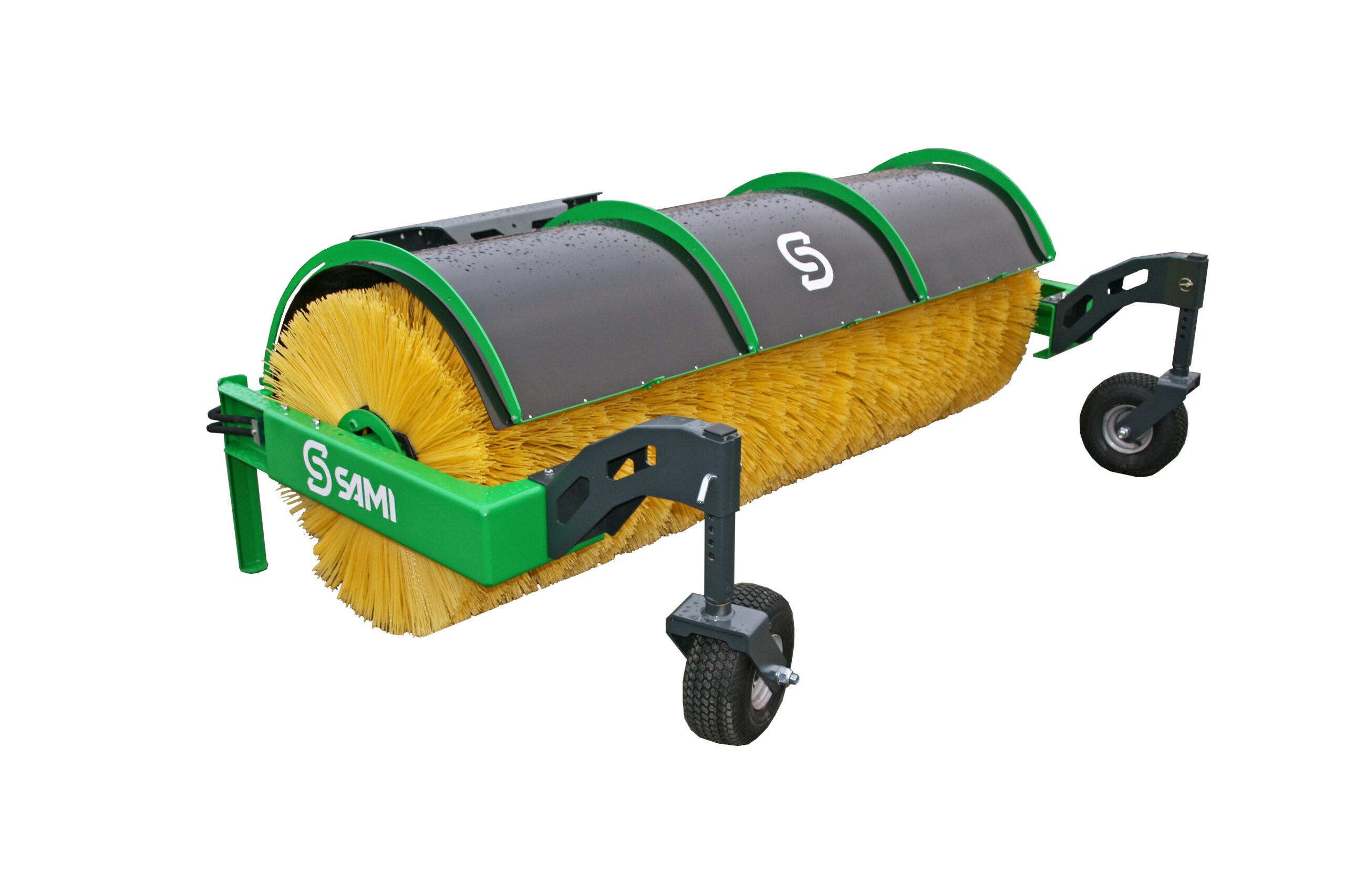 Sami feiemaskin leveres med standard Trima SMS kobling. Kan både trekkes og skyves. Leveres som standard med hjul og Ø900 feieringer, 28graders hydraulisk sving hver vei. Kan utstyres med vanning (dyser, dyseledning, 12V pumpe)